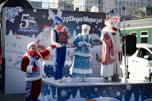 (251119) -- VLADIVOSTOK, 19 noviembre, 2025 (Xinhua) -- Actores interpretan los papeles del "Padre Escarcha" y "La Doncella de Nieve" mientras realizan una presentación junto a otros actores, en Vladivostok, Rusia, el 19 de noviembre de 2025. Para celebrar la Navidad y el Año Nuevo, el tren del "Padre Escarcha" partió de Vladivostok el 19 de noviembre, iniciando un recorrido por Rusia. (Xinhua/Andrey Matveenko) (ah) (ra) (ce)