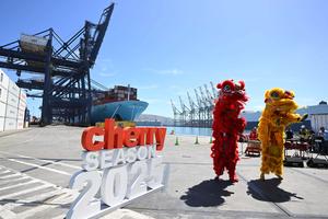 (251119) -- SAN ANTONIO, 19 noviembre, 2025 (Xinhua) -- Imagen del 18 de noviembre de 2025 de artistas realizando una presentación de la danza del león durante la ceremonia de lanzamiento de la temporada de exportación de cerezas 2025-2026 en las dependencias de San Antonio Terminal Internacional, en el puerto de San Antonio, en la región de Valparaíso, Chile. Chile comenzó esta semana la temporada de exportación de cerezas frescas 2025-2026 por vía marítima, con barcos de ruta directa hacia China para abastecer al mercado asiático en su temporada invernal. (Xinhua/Jorge Villegas) (jv) (jg) (da) (ce)