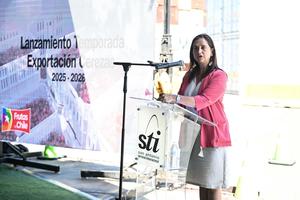 (251119) — SAN ANTONIO, 19 noviembre, 2025 (Xinhua) — Imagen del 18 de noviembre de 2025 de la ministra de Agricultura de Chile, Ignacia Fernández, pronunciando un discurso durante la ceremonia de lanzamiento de la temporada de exportación de cerezas 2025-2026 en las dependencias de San Antonio Terminal Internacional, en el puerto de San Antonio, en la región de Valparaíso, Chile. Chile comenzó esta semana la temporada de exportación de cerezas frescas 2025-2026 por vía marítima, con barcos de ruta directa hacia China para abastecer al mercado asiático en su temporada invernal. (Xinhua/Jorge Villegas) (jv) (jg) (da) (ce)