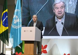 (251120) -- BELEM, 20 noviembre, 2025 (Xinhua) -- El secretario general de la Organización de las Naciones Unidas (ONU), António Guterres, habla en una conferencia de prensa durante la 30ª Conferencia de las Partes (COP30) de la Convención Marco de las Naciones Unidas sobre Cambio Climático, en Belém, estado de Pará, Brasil, el 20 de noviembre de 2025. Guterres llamó el jueves de manera urgente a los países a lograr un acuerdo justo y equilibrado que responda a la gravedad de la crisis climática, en el marco de la COP30 que se lleva a cabo hasta el 21 de noviembre en la ciudad brasileña de Belém. (Xinhua/Lucio Tavora) (lt) (rtg) (ra) (ce)