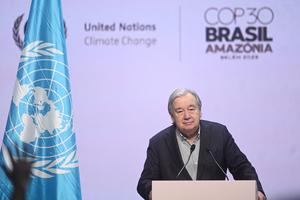 (251120) -- BELEM, 20 noviembre, 2025 (Xinhua) -- El secretario general de la Organización de las Naciones Unidas (ONU), António Guterres, participa en una conferencia de prensa durante la 30ª Conferencia de las Partes (COP30) de la Convención Marco de las Naciones Unidas sobre Cambio Climático, en Belém, estado de Pará, Brasil, el 20 de noviembre de 2025. Guterres llamó el jueves de manera urgente a los países a lograr un acuerdo justo y equilibrado que responda a la gravedad de la crisis climática, en el marco de la COP30 que se lleva a cabo hasta el 21 de noviembre en la ciudad brasileña de Belém. (Xinhua/Lucio Tavora) (lt) (rtg) (ra) (ce)