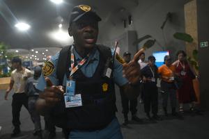 (251120) -- BELEM, 20 noviembre, 2025 (Xinhua) -- Personal de seguridad trabaja en la evacuación de los asistentes tras un incendio en uno de los pabellones de la 30ª Conferencia de las Partes (COP30) de la Convención Marco de las Naciones Unidas sobre el Cambio Climático, en Belém, estado de Pará, Brasil, el 20 de noviembre de 2025. Un fuerte incendio se registró el jueves en uno de los pabellones donde se desarrolla la COP30 en la ciudad de Belém, capital del estado brasileño de Pará, lo que obligó a evacuar a miles de personas por parte de los bomberos responsables de la seguridad del evento. (Xinhua/Lucio Tavora) (lt) (ah) (ra) (ce)