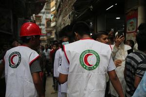 (251121) -- DHAKA, 21 noviembre, 2025 (Xinhua) -- Rescatistas locales trabajan en un área afectada por un terremoto, en Dhaka, Bangladesh, el 21 de noviembre de 2025. Se ha confirmado la muerte de al menos seis personas durante un terremoto de magnitud 5,7 que sacudió el viernes por la mañana la capital Dhaka y partes de Bangladesh. (Xinhua/Habibur Rahman) (rtg) (ra) (ce)