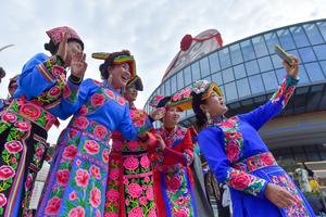 (251121) -- WENCHUAN, 21 noviembre, 2025 (Xinhua) -- Imagen del 20 de noviembre de 2025 de mujeres portando atuendos étnicos tomándose una fotografía durante un evento para celebrar el Año Nuevo de los qiang, en el distrito de Wenchuan, en la prefectura autónoma tibetana y qiang de Aba, en la provincia de Sichuan, en el suroeste de China. Un evento para celebrar el Año Nuevo de los qiang se llevó a cabo aquí de miércoles a jueves, con una serie de actividades. (Xinhua/Li Xiangyu) (oa) (ra) (ce)