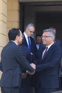 (251121) -- NICOSIA, 21 noviembre, 2025 (Xinhua) -- Imagen del 20 de noviembre de 2025 del presidente chipriota, Nikos Christodoulides (i), estrechando la mano del líder turcochipriota, Tufan Erhurman (d), en Nicosia, Chipre. Los líderes de las comunidades grecochipriota y turcochipriota acordaron el jueves trabajar para reactivar las conversaciones de reunificación estancadas desde hace tiempo, informó la Fuerza de las Naciones Unidas para el Mantenimiento de la Paz en Chipre. (Xinhua/George Christophorou) (jg) (da) (ce)