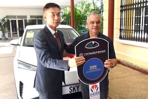 (251122) -- LA HABANA, 22 noviembre, 2025 (Xinhua) -- Imagen del 21 de noviembre de 2025 del embajador de China en Cuba, Hua Xin (i), y el presidente del Instituto Nacional de Deportes, Educación Física y Recreación (Inder) de Cuba, Osvaldo Vento (d), sosteniendo la llave simbólica de un auto eléctrico donado en una ceremonia oficial, en La Habana, capital de Cuba. China donó el viernes un auto eléctrico al Inder de Cuba, en un acto que refuerza la cooperación bilateral en el sector. (Xinhua/Joaquín Hernández) (jh) (jg) (da)