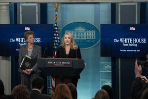 (251121) -- WASHINGTON, 21 noviembre, 2025 (Xinhua) -- Imagen del 20 de noviembre de 2025 de la secretaria de prensa de la Casa Blanca, Karoline Leavitt (d), hablando durante una conferencia de prensa diaria en la Casa Blanca, en Washington D. C., Estados Unidos. El secretario del Ejército estadounidense, Daniel Driscoll, se mostró "muy optimista" tras reunirse el jueves en Kiev con el presidente ucraniano, Volodymyr Zelenski, para discutir un nuevo plan de paz estadounidense, de acuerdo con Leavitt. (Xinhua/Hu Yousong) (oa) (ra) (ce)