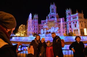 (251123) -- MADRID, 23 noviembre, 2025 (Xinhua) -- Imagen del 22 de noviembre de 2025 de personas posando para una fotografía grupal frente al Palacio de Cibeles, en Madrid, España. Madrid celebró el sábado una ceremonia de encendido navideño con un espectáculo de luces proyectadas. (Xinhua/Cheng Min) (oa) (da)