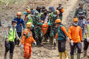 (251121) -- JAVA CENTRAL, 21 noviembre, 2025 (Xinhua) -- Imagen del 20 de noviembre de 2025 de rescatistas trasladando una bolsa para cadáveres tras un deslizamiento de tierra que impactó una zona residencial, en la aldea de Pandanarum, Java Central, Indonesia. Al menos 10 personas han muerto y otras 18 siguen desaparecidas después de que un deslizamiento de tierra impactara una zona residencial en la provincia de Java Central, en Indonesia, informaron las autoridades este viernes. (Xinhua/Joni Amarta) (jg) (da) (ce)