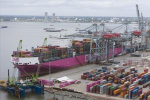 (251121) — MONTEVIDEO, 21 noviembre, 2025 (Xinhua) — Vista aérea tomada con un dron el 21 de noviembre de 2025 del buque portacontenedores One Strength, de 336 metros de largo, perteneciente a la naviera Ocean Network Express, en el Puerto de Montevideo, en Montevideo, capital de Uruguay. (Xinhua/Nicolás Celaya) (nc) (oa) (ra) (ce)