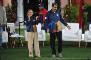 (251121) -- CARACAS, 21 noviembre, 2025 (Xinhua) -- El presidente venezolano, Nicolás Maduro (d-frente), y la primera dama venezolana, Cilia Flores (i-frente), participan en un acto por el Día del Estudiante Venezolano, en Caracas, Venezuela, el 21 de noviembre de 2025. Los estudiantes venezolanos se movilizaron el viernes en Caracas para celebrar su día y en defensa de la paz y la educación. (Xinhua/Marcos Salgado) (ms) (rtg) (ra) (ce)