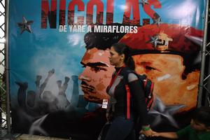 (251123) -- CARACAS, 23 noviembre, 2025 (Xinhua) -- Imagen del 22 de noviembre de 2025 de una mujer y un niño caminando frente a un anuncio de la biográfica "Nicolás, de Yare a Miraflores", en el Teatro Principal , en Caracas, Venezuela. (Xinhua/Marcos Salgado) (ms) (oa) (ah)