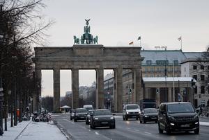 (251124) -- BERLIN, 24 noviembre, 2025 (Xinhua) -- Vehículos circulan frente a la Puerta de Brandeburgo, en Berlín, Alemania, el 24 de noviembre de 2025. Berlín registró el lunes la primera nevada de la temporada invernal. (Xinhua/Zhang Haofu) (oa) (ah) (ce)