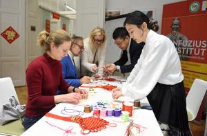 (251122) -- GRAZ, 22 noviembre, 2025 (Xinhua) -- Imagen del 21 de noviembre de 2025 de invitados probando la elaboración de nudos chinos en un evento para celebrar el 15º aniversario del Instituto Confucio de la Universidad de Graz, en Graz, Austria. (Xinhua/He Canling) (jg) da)