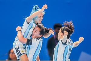 (251124) -- CIUDAD DE PASIG, 24 noviembre, 2025 (Xinhua) -- Jugadoras de Argentina festejan una anotación durante el partido del grupo A entre Argentina y Polonia en la Copa Mundial Femenina de Futsal de la FIFA 2025, en la Ciudad de Pasig, Filipinas, el 24 de noviembre de 2025. (Xinhua/Rouelle Umali) (rtg) (ah) (ce)