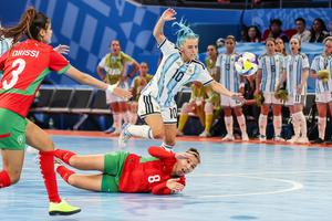 (251122) -- CIUDAD DE PASIG, 22 noviembre, 2025 (Xinhua) -- Imagen del 21 de noviembre de 2025 de Silvina Nava (arriba), de Argentina, disputando el balón con Meryem Hajri (abajo), de Marruecos, durante el partido entre Argentina y Marruecos en la Copa Mundial Femenina de Futsal de la FIFA 2025, en la Ciudad de Pasig, Filipinas. (Xinhua/Rouelle Umali) (rtg) (da)