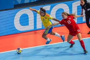 (251122) -- CIUDAD DE PASIG, 22 noviembre, 2025 (Xinhua) -- Dayana Rivera (i), de Colombia, compitiendo ante Katerine Delev (d), de Canadá, durante el partido entre Colombia y Canadá en la Copa Mundial Femenina de Futsal de la FIFA 2025, en la Ciudad de Pasig, Filipinas, el 22 de noviembre de 2025. (Xinhua/Rouelle Umali) (rtg) (da)