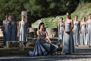 (251124) -- ANTIGUA OLIMPIA, 24 noviembre, 2025 (Xinhua) -- La actriz, Mary Mina, interpreta el papel de la antigua Alta Sacerdotisa griega mientras participa en el ensayo con vestuario de la ceremonia de encendido de la llama Olímpica para los Juegos Olímpicos de Invierno Milán Cortina 2026, en la Antigua Olimpia, Grecia, el 24 de noviembre de 2025. (Xinhua/Li Jing) (rtg) (ah) (ce)