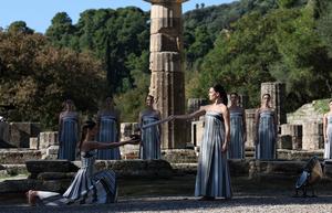 (251124) -- ANTIGUA OLIMPIA, 24 noviembre, 2025 (Xinhua) -- La actriz, Mary Mina (d-frente), interpreta el papel de la antigua Alta Sacerdotisa griega mientras participa en el ensayo con vestuario de la ceremonia de encendido de la llama Olímpica para los Juegos Olímpicos de Invierno Milán Cortina 2026, en la Antigua Olimpia, Grecia, el 24 de noviembre de 2025. (Xinhua/Li Jing) (rtg) (ah) (ce)