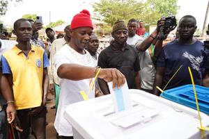 (251124) -- BISSAU, 24 noviembre, 2025 (Xinhua) -- Imagen del 23 de noviembre de 2025 del candidato presidencial independiente, Fernando Dias da Costa, emitiendo su voto en un colegio electoral, en Mansoa, en la región de Oio, Guinea-Bissau. Guinea-Bissau lanzó el domingo sus elecciones presidenciales y legislativas, con más de 960.000 votantes registrados listos para elegir un nuevo jefe de Estado y 102 miembros de la Asamblea Popular Nacional. (Xinhua/Si Yuan) (rtg) (ah) (ce)