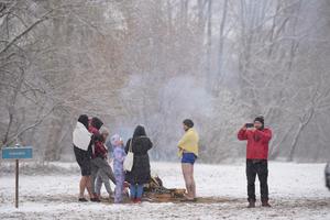 (251124) -- VARSOVIA, 24 noviembre, 2025 (Xinhua) -- Imagen del 23 de noviembre de 2025 de nadadores invernales calentándose junto a una hoguera en las orillas nevadas del río Vístula, en Varsovia, Polonia. El domingo marcó el inicio de la temporada de natación en aguas frías en Varsovia. (Xinhua/Jaap Arriens) (oa) (ah) (ce)