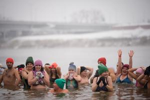 (251124) — VARSOVIA, 24 noviembre, 2025 (Xinhua) — Imagen del 23 de noviembre de 2025 de aficionados a la natación invernal dándose un chapuzón en las gélidas aguas del río Vístula, en Varsovia, Polonia. El domingo marcó el inicio de la temporada de natación en aguas frías en Varsovia. (Xinhua/Jaap Arriens) (oa) (ah) (ce)