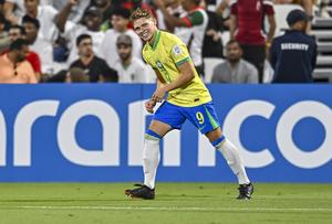 (251122) -- DOHA, 22 noviembre, 2025 (Xinhua) -- Imagen del 21 de noviembre de 2025 de Dell, de Brasil, festejando después de realizar la primera anotación durante el partido de cuartos de final entre Brasil y Marruecos en la Copa Mundial Sub-17 de la FIFA Qatar 2025, en Doha, Qatar. (Xinhua/Nikku) (rtg) (da)