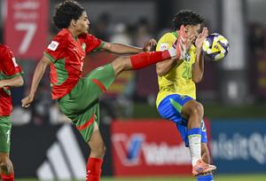 (251122) -- DOHA, 22 noviembre, 2025 (Xinhua) -- Imagen del 21 de noviembre de 2025 de Felipe Morais (d), de Brasil, disputando el balón con Elyes Saidi, de Marruecos, durante el partido de cuartos de final en la Copa Mundial Sub-17 de la FIFA Qatar 2025, en Doha, Qatar. (Xinhua/Nikku) (rtg) (da)
