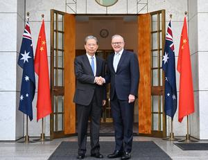 (251125) -- CANBERRA, 25 noviembre, 2025 (Xinhua) -- Zhao Leji, presidente del Comité Permanente de la Asamblea Popular Nacional de China, asiste a un desayuno de trabajo ofrecido por el primer ministro australiano, Anthony Albanese, en Canberra, Australia, el 25 de noviembre de 2025. Zhao realizó una visita oficial al país de sábado a martes por invitación de la presidenta del Senado australiano, Sue Lines, y del presidente de la Cámara de Representantes, Milton Dick. (Xinhua/Li Xiang) (jg) (ra) (ce)