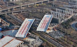 (251126) -- TIANJIN, 26 noviembre, 2025 (Xinhua) -- Vista aérea tomada con un dron el 26 de noviembre de 2025 del sitio de construcción de los puentes giratorios gemelos de la autopista Xinggang, en Tianjin, en el norte de China. Los puentes giratorios gemelos de la autopista Xinggang completaron su rotación aquí el miércoles. Dos vigas continuas, cada una con un peso de 14.000 toneladas, giraron simultáneamente en el sentido de las agujas del reloj por más de 60 grados para pasar sobre una vía férrea. (Xinhua/Li Ran) (jg) (da) (ce)