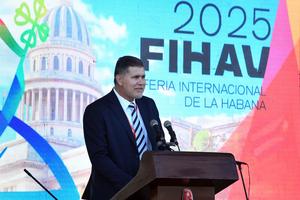 (251125) -- LA HABANA, 25 noviembre, 2025 (Xinhua) -- Imagen del 24 de noviembre de 2025 del vice primer ministro y ministro de Comercio Exterior e Inversión Extranjera de Cuba, Oscar Pérez-Oliva, pronunciando un discurso durante la inauguración de la edición 41 de la Feria Internacional de La Habana (FIHAV 2025) en el recinto ferial Expocuba, en La Habana, capital de Cuba. El Gobierno cubano busca impulsar el comercio y la inversión extranjera con la apertura el lunes de la edición 41 de la FIHAV 2025, que se extenderá hasta el próximo 29 de noviembre. (Xinhua/Joaquín Hernández) (jh) (jg) (ra) (vf)