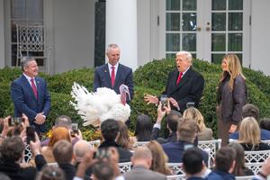 (251125) -- WASHINGTON, 25 noviembre, 2025 (Xinhua) -- El presidente estadounidense, Donald Trump (2-d), asiste a la Ceremonia Nacional de Indulto del Pavo de Acción de Gracias, en la Casa Blanca, en Washington D. C., Estados Unidos, el 25 de noviembre de 2025. (Xinhua/Hu Yousong) (oa) (ah) (ce)