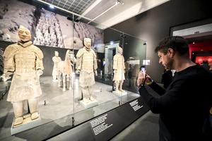 (251126) -- BUDAPEST, 26 noviembre, 2025 (Xinhua) -- Un visitante toma fotografías de las exhibiciones durante la vista previa para los medios de comunicación de la exposición "La Civilización de las Dinastías Qin y Han: Los Guerreros Terracota del Primer Emperador Chino" en el Museo de Bellas Artes, en Budapest, Hungría, el 26 de noviembre de 2025. (Xinhua/David Balogh) (ah) (ra) (vf)