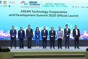 (251125) -- KUALA LUMPUR, 25 noviembre, 2025 (Xinhua) -- El vice primer ministro malasio, Fadillah Yusof (c), también ministro de Transición Energética y Transformación Hídrica de Malasia, posa para una fotografía grupal con invitados en la ceremonia inaugural de la Cumbre de Cooperación y Desarrollo Tecnológico de la Asociación de Naciones del Sudeste Asiático (ASEAN) 2025, en Kuala Lumpur, Malasia, el 25 de noviembre de 2025. El enorme potencial de la ASEAN debe aprovecharse para que la región se convierta en un centro global de innovación, tecnología y progreso sostenible, dijo el martes Yusof. (Xinhua/Chong Voon Chung) (jg) (ra) (ce)