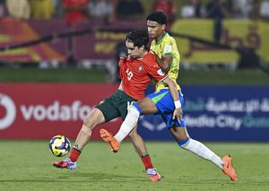 (251125) -- DOHA, 25 noviembre, 2025 (Xinhua) -- Imagen del 24 de noviembre de 2025 de Mateus Mide (i), de Portugal, disputando el balón con Luccas Ramon, de Brasil, durante el partido de semifinal entre Portugal y Brasil en la Copa Mundial Sub-17 de la FIFA Qatar 2025, en Doha, Qatar. (Xinhua/Nikku) (oa) (ah) (ce)