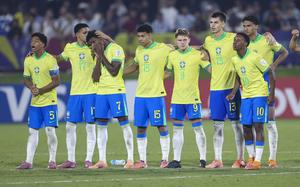 (251125) -- DOHA, 25 noviembre, 2025 (Xinhua) -- Imagen del 24 de noviembre de 2025 de jugadores de Brasil reaccionando durante la tanda de penales del partido de semifinal entre Portugal y Brasil en la Copa Mundial Sub-17 de la FIFA Qatar 2025, en Doha, Qatar. (Xinhua/Nikku) (oa) (ah) (ce)