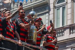 (251130) -- RIO DE JANEIRO, 30 noviembre, 2025 (Xinhua) -- El jugador Pedro (c), de Flamengo, habla mientras su compañero Danilo (2-i), sostiene el trofeo durante el desfile del equipo a bordo de un autobús descapotable para festejar su cuarto título de Copa Libertadores del club, en el centro de Río de Janeiro, Brasil, el 30 de noviembre de 2025. (Xinhua/Claudia Martini) (cm) (rtg) (ah) (da)