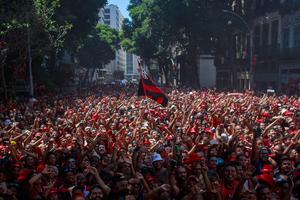 (251130) -- RIO DE JANEIRO, 30 noviembre, 2025 (Xinhua) -- Aficionados de Flamengo festejan durante el desfile del equipo a bordo de un autobús descapotable para festejar el cuarto título de Copa Libertadores, en el centro de Río de Janeiro, Brasil, el 30 de noviembre de 2025. (Xinhua/Claudia Martini) (cm) (rtg) (ah) (da)
