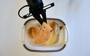 (251127) -- HEFEI, 27 noviembre, 2025 (Xinhua) -- Imagen del 25 de noviembre de 2025 de un robot humanoide, operado por un trabajador con fines de recopilación de datos, tomando objetos en Zerith, una empresa de robótica, en Hefei, en la provincia de Anhui, en el este de China. En los últimos años, Hefei ha promovido activamente el desarrollo de su industria de robots inteligentes. La ciudad alberga actualmente un sistema industrial de cadena completa para la investigación, el desarrollo y la fabricación de robótica, compuesto por 190 empresas relacionadas. (Xinhua/Zhou Mu) (da) (ra) (vf)