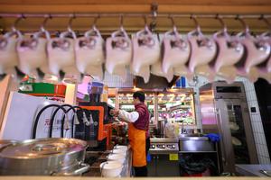 (251127) — TIANJIN, 27 noviembre, 2025 (Xinhua) — Imagen del 25 de noviembre de 2025 de un dueño de un puesto preparando alimentos en el mercado de abarrotes Sanshui, en el distrito de Hexi de Tianjin, en el norte de China. Con sala de lectura, cafetería y puestos de comestibles reunidos bajo el mismo techo, el mercado de Sanshui, un lugar de compras tradicional con más de 20 años de antigüedad, cobró nueva vida cuando se sometió a un proyecto de remodelación y abrió sus puertas nuevamente en septiembre de este año. (Xinhua/Sun Fanyue) (da) (ra) (vf)