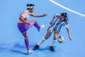 (251127) -- CIUDAD DE PASIG, 27 noviembre, 2025 (Xinhua) -- Dionesia Tolentin (i), de Filipinas, compite ante Maca Espinosa (d), de Argentina, durante el partido del grupo A entre Argentina y Filipinas en la Copa Mundial Femenina de Futsal de la FIFA 2025, en la Ciudad de Pasig, Filipinas, el 27 de noviembre de 2025. (Xinhua/Rouelle Umali) (rtg) (ra) (vf)