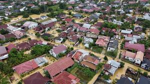 (251127) -- ACEH, 27 noviembre, 2025 (Xinhua) -- Vista aérea tomada con un dron el 27 de noviembre de 2025 de una zona residencial afectada por las inundaciones después de las fuertes lluvias, en la provincia de Aceh, Indonesia. Nueve personas murieron después de que inundaciones y deslizamientos de tierra afectaran a múltiples regencias y poblados en la provincia de Aceh, en la punta norte de la isla de Sumatra de Indonesia, dijeron funcionarios locales el jueves. (Xinhua/Yulham) (rtg) (ra) (ce)