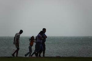 (251127) -- COLOMBO, 27 noviembre, 2025 (Xinhua) -- Una familia camina a través de fuertes vientos, en Colombo, Sri Lanka, el 27 de noviembre de 2025. El Departamento de Meteorología de Sri Lanka emitió el jueves una alerta roja tanto para tierra como para las áreas marítimas circundantes, ya que la profunda depresión que se había formado cerca de la costa de Sri Lanka en la Bahía de Bengala se ha intensificado hasta convertirse en un ciclón, ahora llamado "Ditwah". (Xinhua/Thilina Kaluthotage) (jg) (ah) (ce)