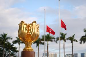 (251129) -- HONG KONG, 29 noviembre, 2025 (Xinhua) -- Un servicio conmemorativo es llevado a cabo en homenaje a las víctimas del incendio de edificios residenciales, en Hong Kong, en el sur de China, el 29 de noviembre de 2025. La bandera nacional china y la bandera de la Región Administrativa Especial de Hong Kong ondearon a media asta en todos los edificios gubernamentales. (Xinhua/Lui Siu Wai) (jg) (da)