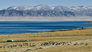 (251128) -- XINING, 28 noviembre, 2025 (Xinhua) -- Vista aérea tomada con un dron de un rebaño de ovejas en la orilla sur del lago Qinghai, en la provincia de Qinghai, en el noroeste de China, el 28 de noviembre de 2025. (Xinhua/Du Xiaowei) (jg) (da) (vf)