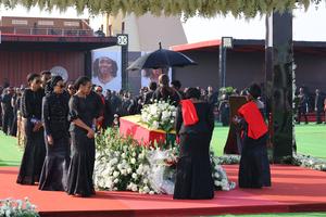 (251129) -- ACCRA, 29 noviembre, 2025 (Xinhua) -- Imagen del 28 de noviembre de 2025 de familiares de la exprimera dama, Nana Konadu Agyeman-Rawlings, presentando sus respetos ante su féretro durante un funeral de Estado, en Accra, Ghana. Ghana celebró el viernes un funeral de Estado en la Plaza de la Estrella Negra, en Accra, la capital ghanesa, para la exprimera dama, Nana Konadu Agyeman-Rawlings. Agyeman-Rawlings fue la esposa del fallecido expresidente, Jerry John Rawlings, y fundadora del Movimiento de Mujeres 31 de Diciembre, una organización no gubernamental que aboga por el empoderamiento de las mujeres, los derechos de los niños y la inclusión social de los grupos marginados. (Xinhua/Seth) (oa) (da)