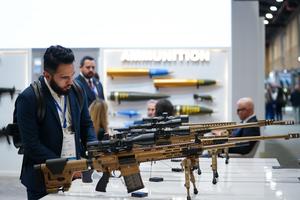 (251202) -- BOGOTA, 2 diciembre, 2025 (Xinhua) -- Imagen del 1 de diciembre de 2025 de un hombre observando armamento durante el primer día de Expodefensa 2025 en el recinto ferial Corferias, en Bogotá, capital de Colombia. Con la presencia del ministro de Defensa de Colombia, Pedro Sánchez, abrió sus puertas Expodefensa 2025, una feria internacional que reúne a empresas líderes del sector de la seguridad y la defensa a nivel mundial. La edición de este año cuenta con pabellones de 28 países en el gran salón del recinto ferial Corferias de Bogotá. (Xinhua/Andrés Moreno) (am) (jg) (ra) (vf)