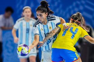 (251201) -- CIUDAD DE PASIG, 1 diciembre, 2025 (Xinhua) -- Mailen Romero (i), de Argentina, disputa el balón con Diana Celis, de Colombia, durante el partido de cuartos de final entre Argentina y Colombia, en la Copa Mundial Femenina de Futsal de la FIFA 2025, en la Ciudad de Pasig, Filipinas, el 1 de diciembre de 2025. (Xinhua/Rouelle Umali) (oa) (ah) (vf)