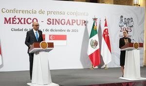 (251201) -- CIUDAD DE MEXICO, 1 diciembre, 2025 (Xinhua) -- La presidenta mexicana, Claudia Sheinbaum (d), y el presidente de Singapur, Tharman Shanmugaratnam (i), asisten a una conferencia de prensa conjunta, en Palacio Nacional, en la Ciudad de México, capital de México, el 1 de diciembre de 2025. (Xinhua/Francisco Cañedo) (fc) (oa) (ah) (vf)