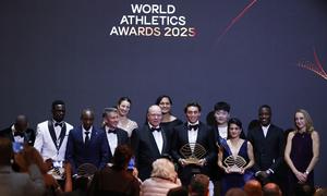 (251201) -- MONTE CARLO, 1 diciembre, 2025 (Xinhua) -- Imagen del 30 de noviembre de 2025 del presidente de World Athletics y ex atleta de pista y campo, Sebastian Coe (4-i), de Reino Unido, el príncipe Alberto II de Mónaco (6-i), posando con los ganadores de los premios en el escenario al término de los Premios Mundiales de Atletismo 2025, en Monte Carlo, Mónaco. (Xinhua/Gao Jing) (rtg) (ah) (vf)